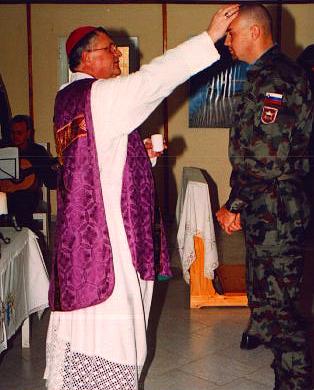 Aschermittwoch 1999: Militärbischof Msgr. Werner feiert ein Pontifikalamt im Camp Duke Leopold (Famagusta) und firmt vorbereitete Soldaten. |